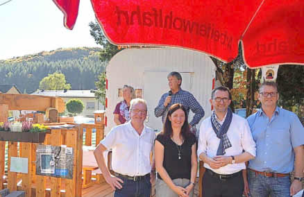 Im Mittelpunkt des Festes stand die Einweihung des vor einigen Monaten von der SPD gestifteten, nun bunt und kindgerecht gestalteten ehemaligen grauen Bauwagens, den der Bürgermeister im Wahlkampf für Bürgersprechstunden genutzt hatte. Zu den mit der Umgestaltung entstandenen Kosten gab es je einen Scheck über 1.000 Euro vom Quadverein Saarland und vom AWO-Landesverband Hauptthema des Festes war das „Gartenprojekt“ in Zusammenarbeit mit den örtlichen Landfrauen des OGV, die ebenfalls recht herzlich begrüßt wurden. Zum dem reichhaltigen Angebot gehörten auch selbst hergestellter Honig; selbst gemachte Marmelade, Nistkästen, Äpfel und eine herbstliche Pyramide. Dankesworte galten der Gärtnerei Bernd Jacobs aus Erbringen für die Blumenspenden, dem Förderverein der Kita für seine Aktivitäten und dem Bürgermeister für die Überlassung des Bauwagens. Im Mittelpunkt des Herbstfestes der AWOKita „Kleine Waldmeister“ Honzrath stand die Einweihung des kinderfreundlich umgestalteten ehemaligen grauen Bauwagens. Hiervon konnten sich der SPDGemeindeverbandsvorsitzende Stefan Krutten, MdL Martin Holzner, Umweltminister Reinhold Jost und Bürgermeister Thomas Collmann (vorne von links) überzeugen. Dahinter sind die Kita-Leiterin Gabriele Hougardy und der OGVVorsitzende Franz-Josef Rychlik.