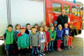 Feuerwehrmann Manfred Gergen erklärte den Kindern die Funktionen des Feuerwahrfahrzeuges. Fotos/Text: Gemeinde Beckingen Nach einer tollen Busfahrt, hieß es für 12 Vorschulkinder der KiTa Honzrath Düppenweiler mit ihren Betreuerinnen Juliette Brettnacher und Margit Arand erst einmal „Ab ins Beckinger Rathaus“ wo es für sie quer durch alle Abteilungen ging. Höhepunkt war natürlich das Arbeitszimmer des Bürgermeisters, das inspiziert und anschließend in Beschlag genommen wurde. „Warum heisst das Rathaus Rathaus?“ und „Was macht man auf dem Rathaus“, waren die neugierigen Fragen der Kinder, denen sich Bürgermeister Thomas Collmann stellen musste. Er verteilte an jedes Kind eine Brotdose mit dem Motiv des Leuchtturms mit seinen Riesenrutschen, der zum Spielplatz des Beckinger „SaarGartens“ gehört. Der Inhalt der Brotdosen, ein kleiner Berliner und ein Getränk, wurde später bei einer Pause im Sitzungssaal des Rathauses verzehrt, was sich diesmal allerdings als klebrige Angelegenheit erwies Nach einem Probesitzen auf dem großen Stuhl hinter dem Schreibtisch des Verwaltungschefs wurde ein Gruppenbild mit dem Bürgermeister gemacht. Anschließend verschafften sich die Kinder einen Einblick über das Beckinger Amtsblatt. „Wer macht es und wo kommt es her“, diese Fragen wurden hier beantwortet und die Kinder bekamen erklärt, wie dort Texte und Fotos eingestellt werden. Auch auf dem Personalamt war es spannend. Überrascht waren die Kinder, was die Gemeindeangestellten auf dem Bürgeramt alles über sie wussten. „Hier bekommt ihr zum Beispiel euren Ausweis, damit ihr in Urlaub fahren könnt“ wurde ihnen erklärt. Auf die Frage: „Wollt ihr auch heiraten?“ war allerdings meistens ein eindeutiges „Neeee“ der Kinder zu vernehmen. Viel Spaß und Gelächter und einmal Standesbeamter spielen, das fanden alle toll. Weiteres absolutes Highlight war die Besichtigung des Feuerwehrautos und des Polizeiautos. Feuerwehrmann Manfred Gergen erklärte den Kindern die Funktionen eines Feuerwehrautos und die Kinder selbst durften das Martinshorn aufheulen lassen. Zum Abschluss statteten die Kinder dem Polizeiposten Beckingen einen Besuch ab und durften im Polizeiauto Platz nehmen. „Mit Polizeimütze und Kelle ausgestattet seht ihr aus wie echte Polizisten“, befand Polizist Uwe Seiwert. Da waren die Kinder schon sehr beeindruckt und nahmen zum Abschluss für ihre Mamas eine Rolle Gelbe Säcke mit nach Hause.